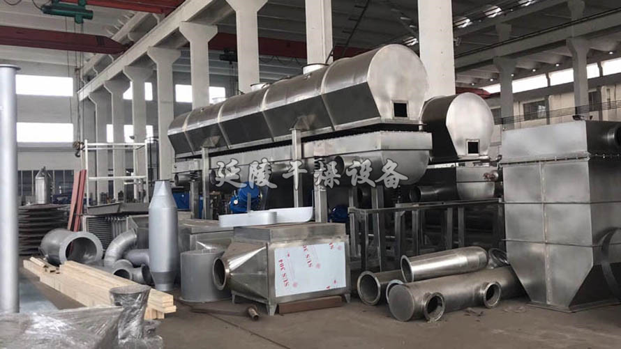 2、该生产线的核心部分:干燥系统。采用分段加热的方式,预干燥段采用高压低风量风机,使较湿的鸡精颗粒能完全流化;干燥段采用低压高风量的风机,单位时间内带走水份多,干燥均匀;冷却段采用高风量风机,能迅速带走热量,降低产品温度,既达到水分控制的要求,又方便后续包装工艺。